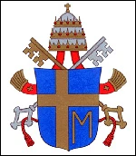 Otro signo de su amor filial a Santa María es su escudo pontificio: sobre un fondo azul, una cruz amarilla, y bajo el madero horizontal derecho, una "M", también amarilla, representando a la Madre que estaba "al pie de la cruz", donde -a decir de San Pablo- en Cristo estaba Dios reconciliando el mundo consigo. En su sorprendente sencillez, su escudo es, pues, una clara expresión de la importancia que el Santo Padre le reconoce a Santa María como eminente cooperadora en la obra de la reconciliación realizada por su Hijo.Su escudo se alza ante todos como una perenne y silente profesión de un amor tierno y filial hacia la Madre del Señor Jesús, y a la vez, es una constante invitación a todos los hijos de la Iglesia para que reconozcamos su papel de cooperadora en la obra de la reconciliación, así como su dinámica función maternal para con cada uno de nosotros. En efecto, "entregándose filialmente a María, el cristiano, como el apóstol Juan, "acoge entre sus cosas propias" a la Madre de Cristo y la introduce en todo el espacio de su vida interior, es decir, en su "yo" humano y cristiano: "La acogió en su casa". Así el cristiano, trata de entrar en el radio de acción de aquella "caridad materna", con la que la Madre del Redentor "cuida de los hermanos de su Hijo", "a cuya generación y educación coopera" según la medida del don, propia de cada uno por la virtud del Espíritu de Cristo. Así se manifiesta también aquella maternidad según el espíritu, que ha llegado a ser la función de María a los pies de la Cruz y en el cenáculo".